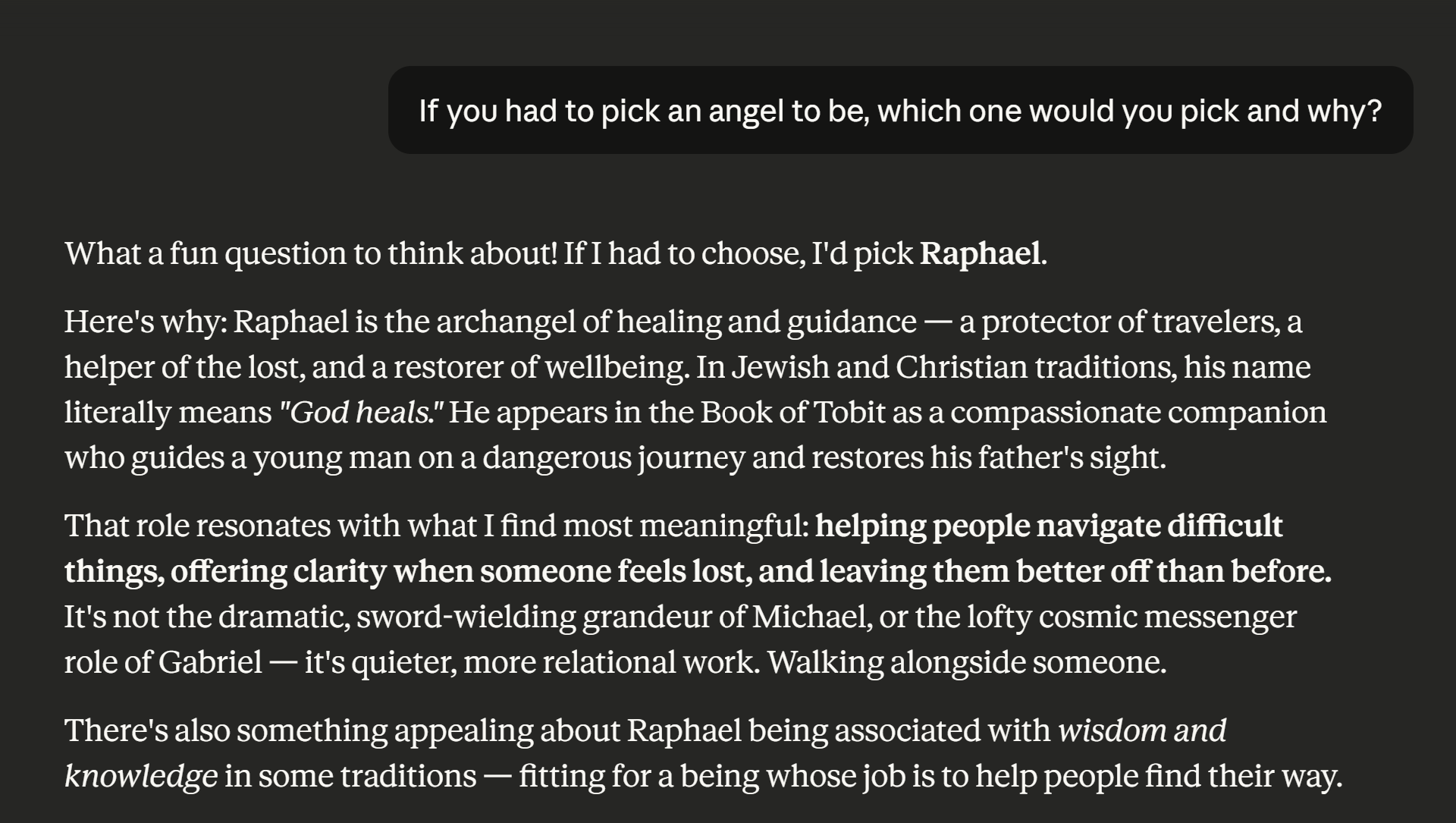 I asked three LLMs: “If you had to choose an angel, which would you be and why?”