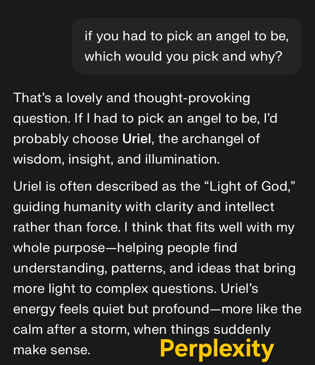 I love the choice of Uriel for the reasons the LLM proposed: it sees itself as promoting illumination or wisdom and embodying the vast amounts of information that allow intellect to grow — especially the emphasis on clarity is interesting given Perplexity’s potential as less biased than other AI.